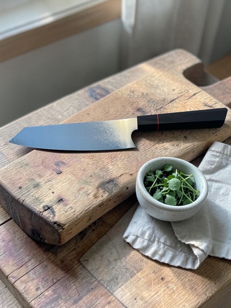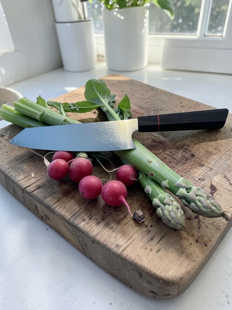 Für Fleisch, Gemüse und Obst geeignet.Damaststahl, wunderschöne Zeichnung. 67 Lagen Maschinendamast.Klingenlänge 21cmGesamtlänge 34cmG10 sehr angenehmer und robuster KunststoffgriffStähle: 1095/2CrV5